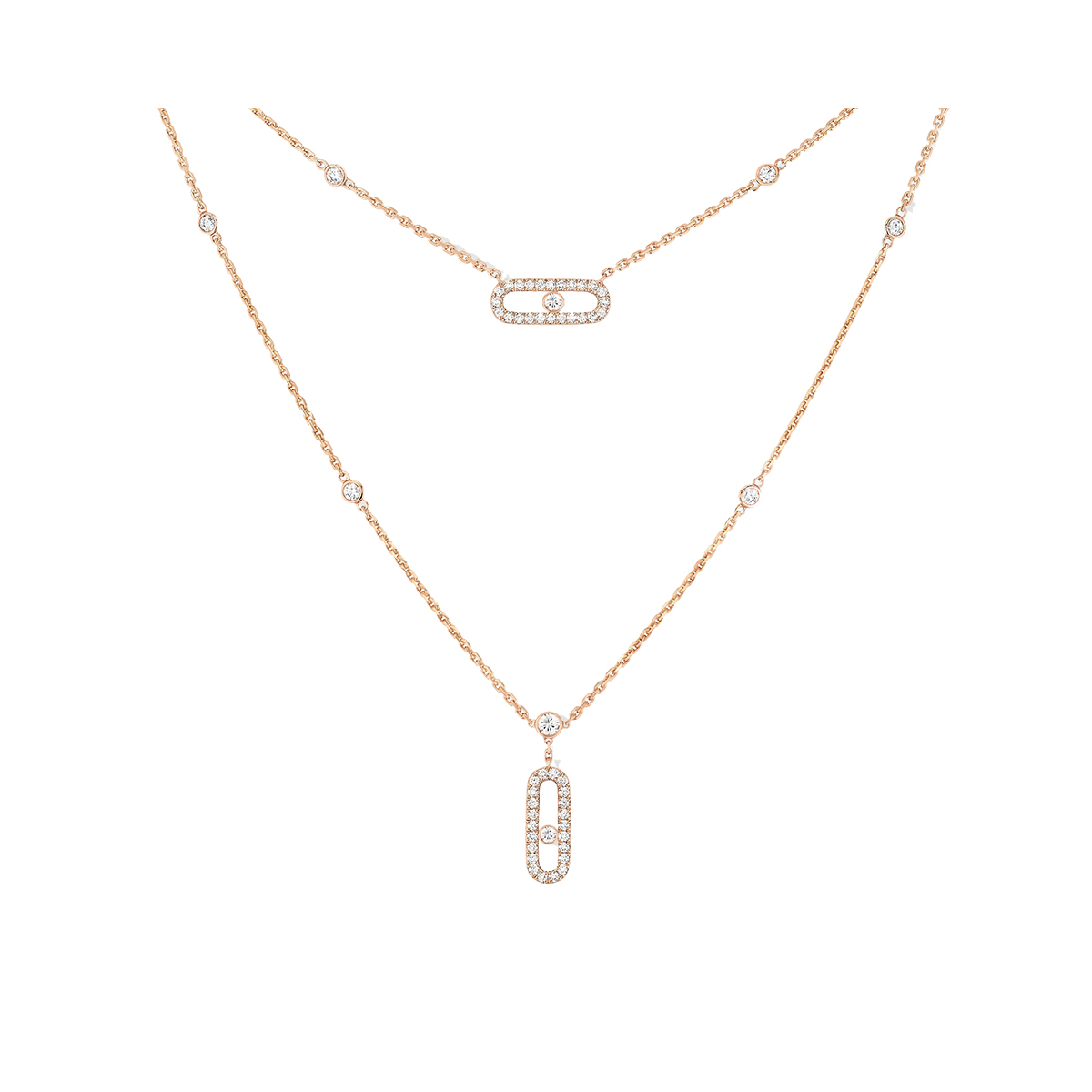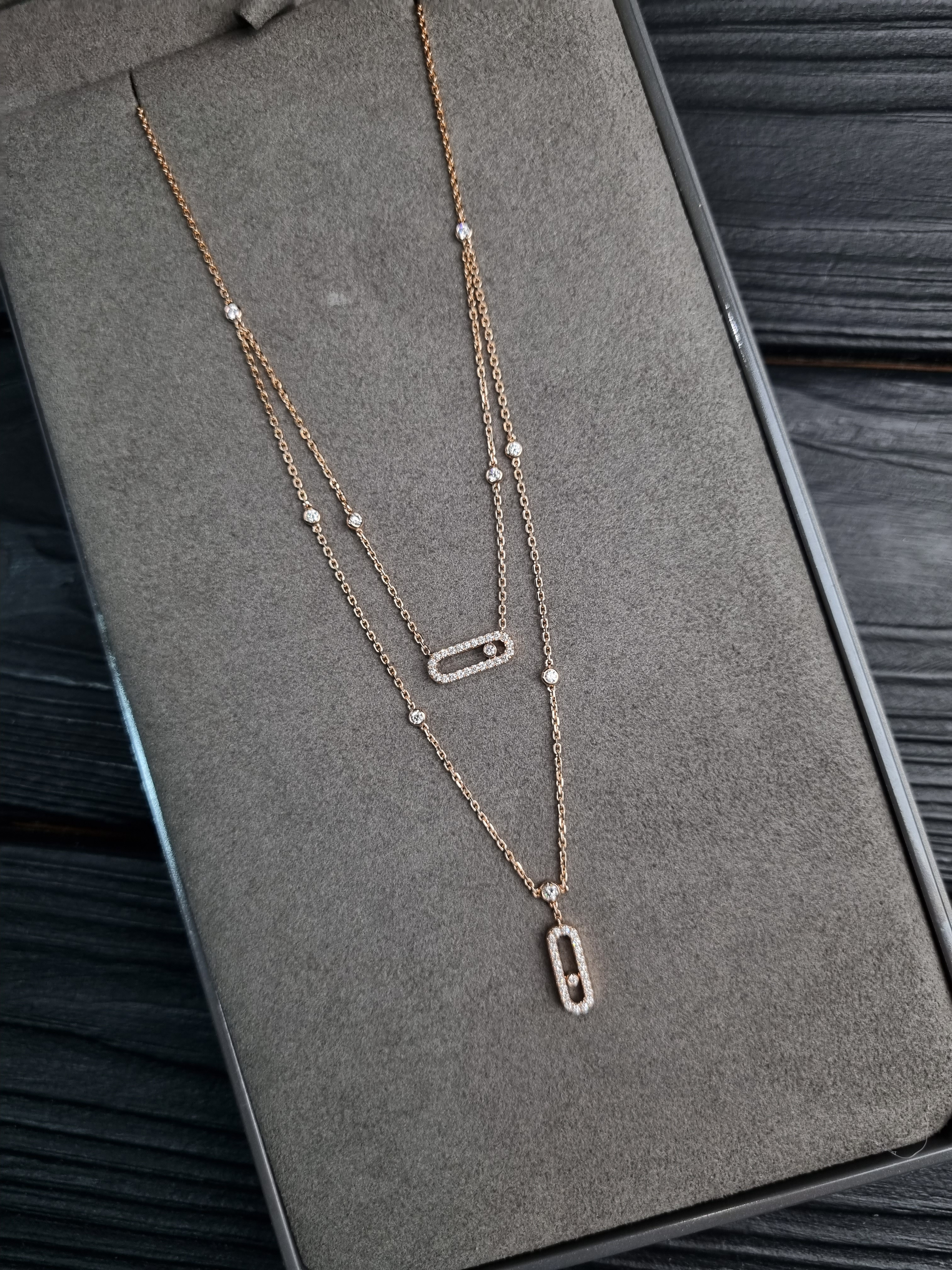 This exquisite Messika Move Uno 2 Rows Pavé necklace is a masterpiece crafted from 750 pink gold, featuring an adjustable chain length of 36, 39, 41, 43, or 45 cm. The stunning design is accentuated by a pendant measuring 14x5 mm, adorned with brilliant diamonds totaling 0.50 ct, G/VS. This breathtaking piece not only showcases impeccable craftsmanship but also comes with a box and papers, ensuring its authenticity and value.
