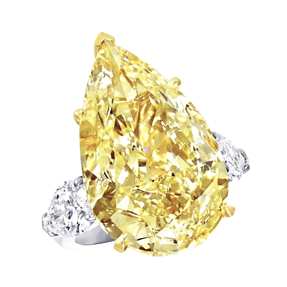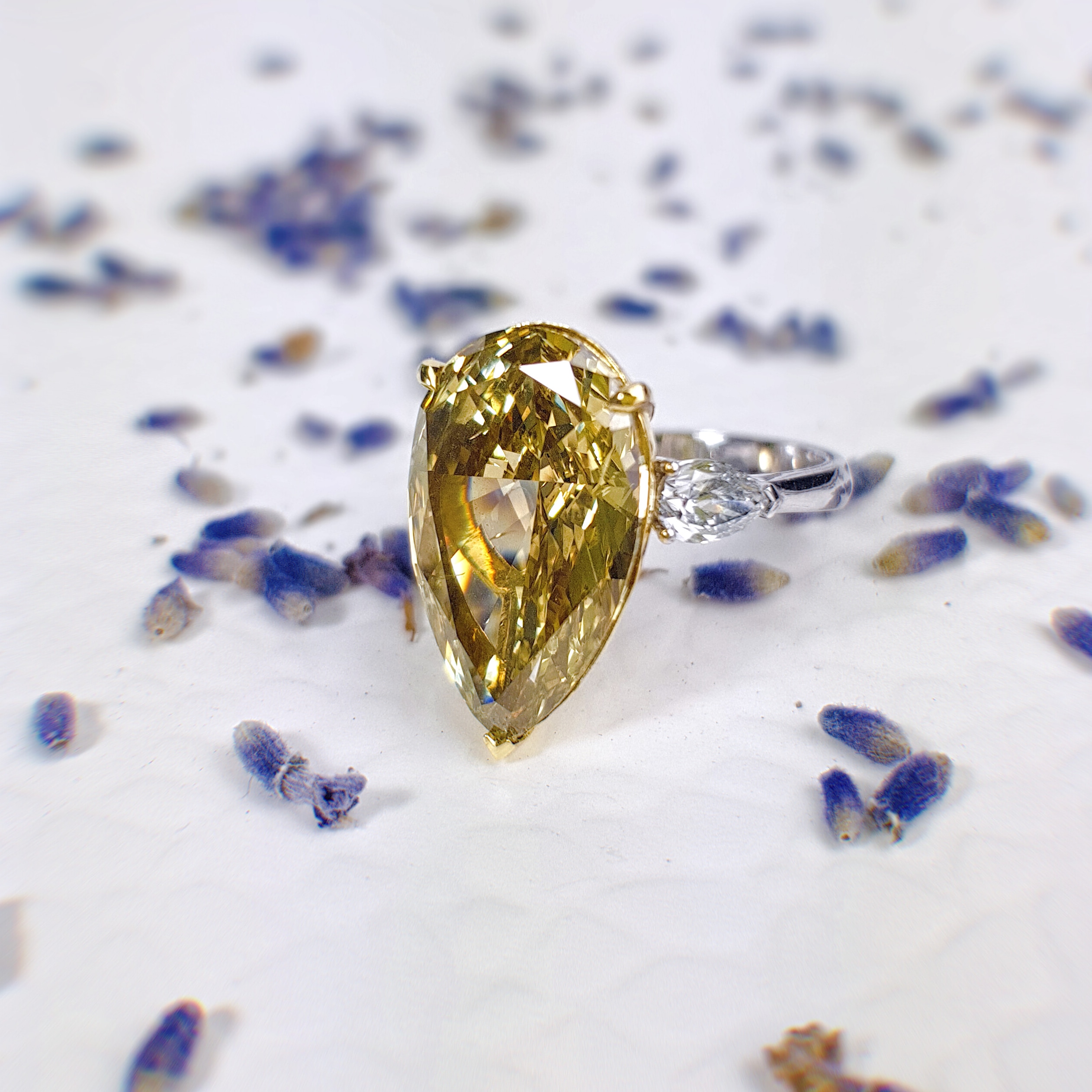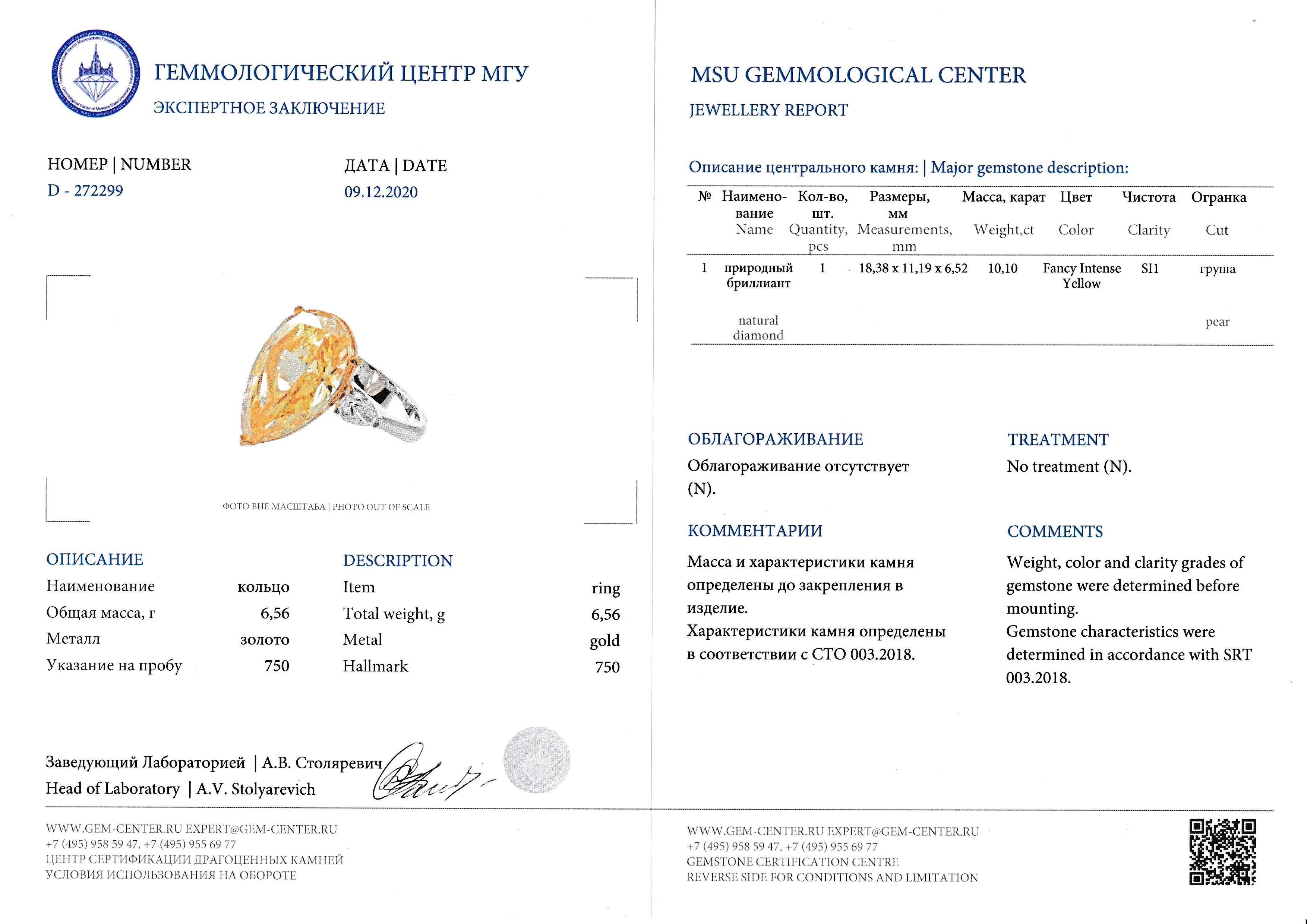 At the heart of this ring lies a breathtaking 10.10 ct. pear-shaped central diamond, certified as FIY/SI1, a true marvel of nature's beauty. The surrounding frame is meticulously adorned with fine white diamonds of VS quality, expertly arranged to create a dazzling spectacle of light and color.