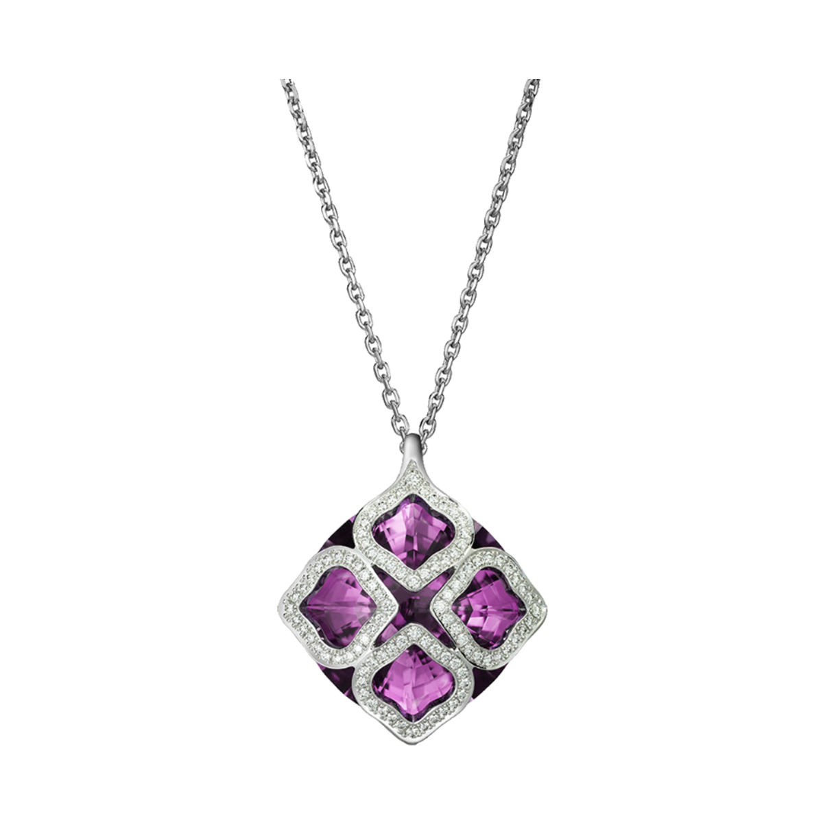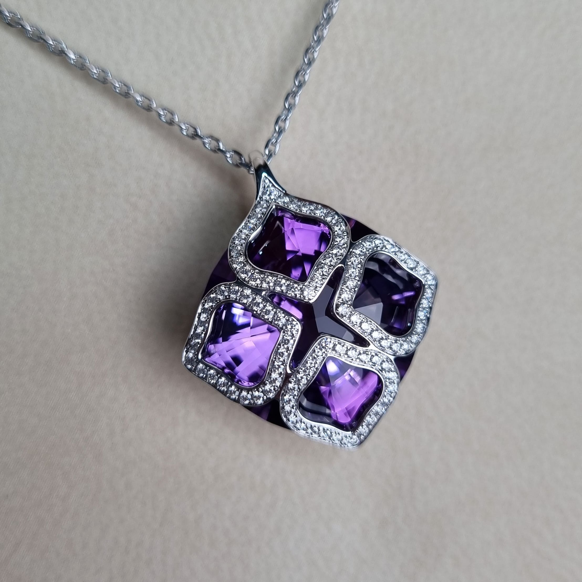 This stunning Chopard Imperiale suspension is a masterpiece of jewelry design, crafted from 750° white gold, a hallmark of luxury and sophistication. The chain, measuring 60 cm in length, is adorned with an extraordinary 1 amethyst stone, weighing 20.00 carats, and 96 brilliant diamonds, totaling 0.42 carats. This intricate creation is not just a piece of jewelry but a work of art that transcends time.