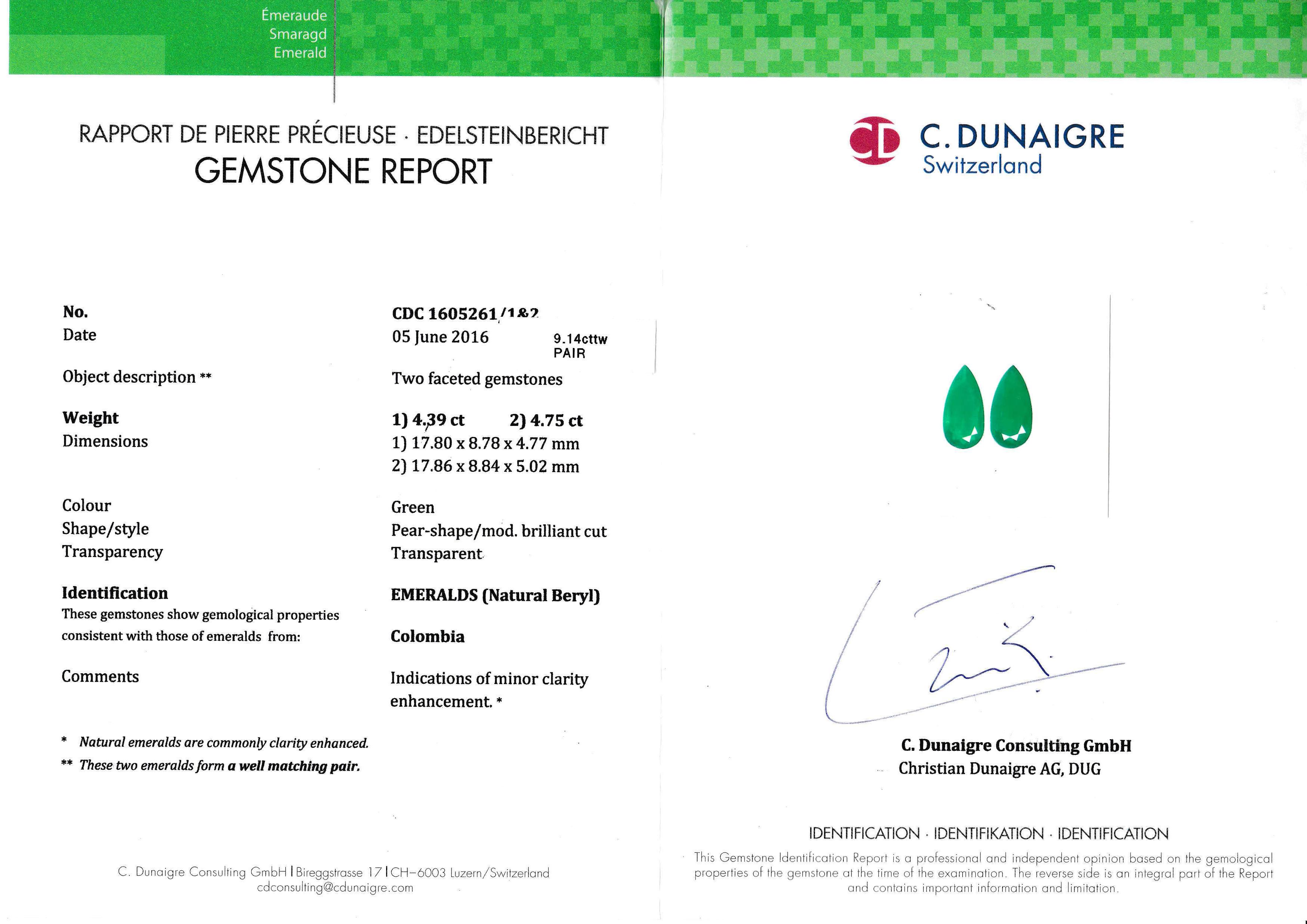 This stunning piece of jewelry is crafted from the finest white gold 750°, a testament to the boutique's commitment to excellence. The emeralds, carefully selected from the revered mines of Colombia, boast an impressive 4.39/4.75 ct. in weight and a mesmerizing green color. The elegance is further enhanced by 18 diamonds, adding a total of 3.85 ct. of fine white/VS+ brilliance, certified by C.Dunaigre. This masterpiece is presented in its original box, complete with all the necessary papers, ensuring its provenance and value.