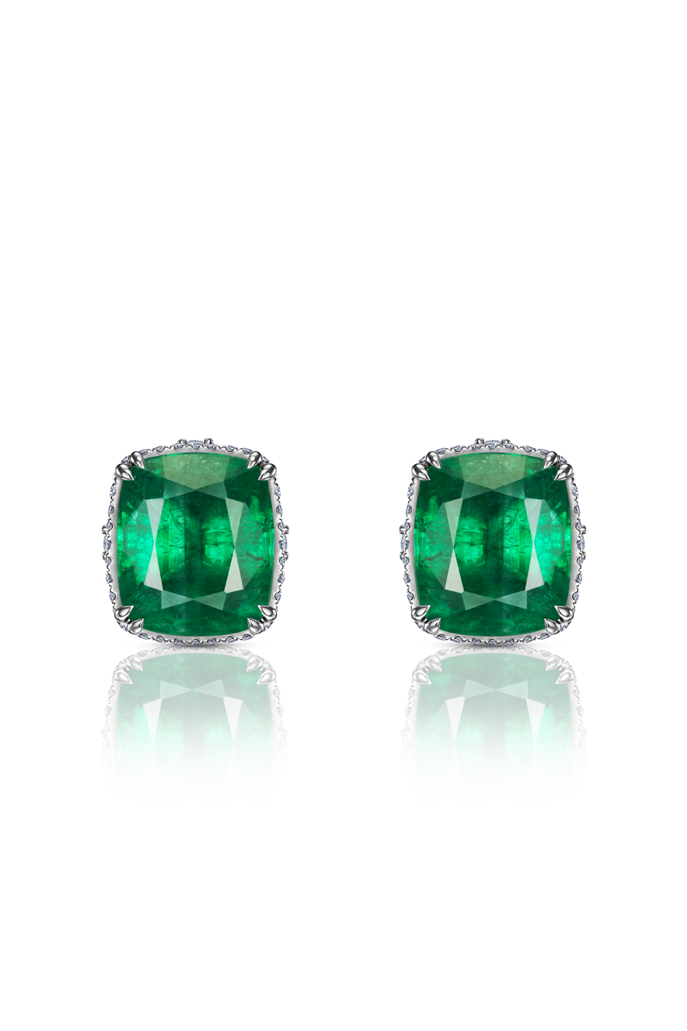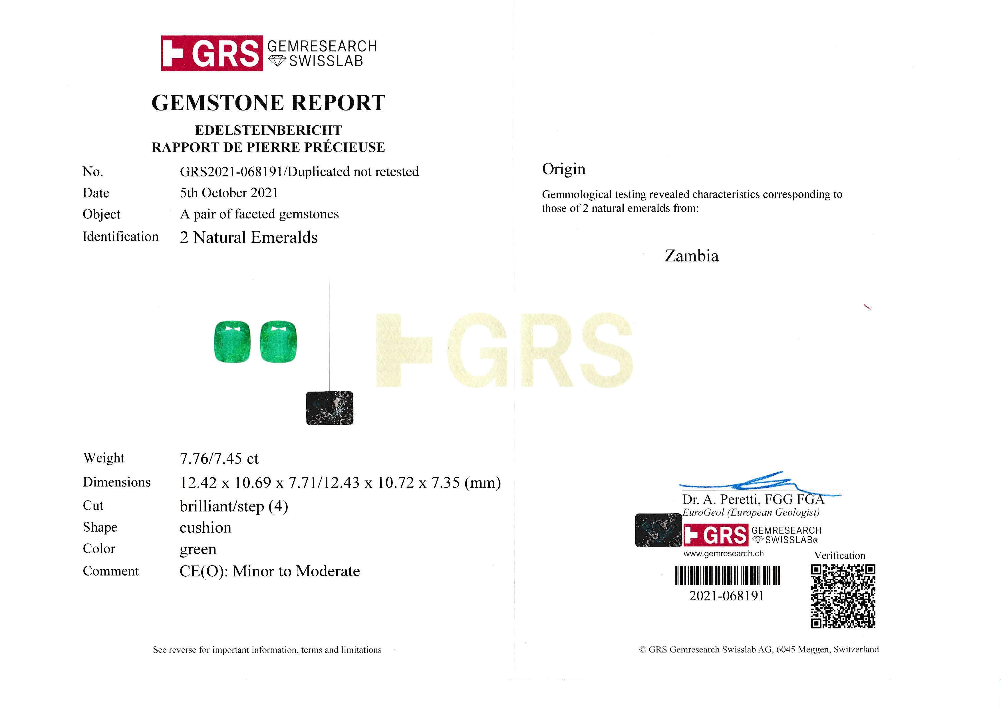 These stunning earrings are crafted from 750° white gold, a testament to the excellence of luxury craftsmanship. The standout feature, however, is the breathtaking combination of emeralds, totalling an impressive 7.76 and 7.45 carats, respectively. These cushion-cut gems boast a vibrant green hue, sourced from the renowned mines of Zambia. Each emerald is certified by the prestigious GRS (GemResearch Swisslab), ensuring their authenticity and superior quality.