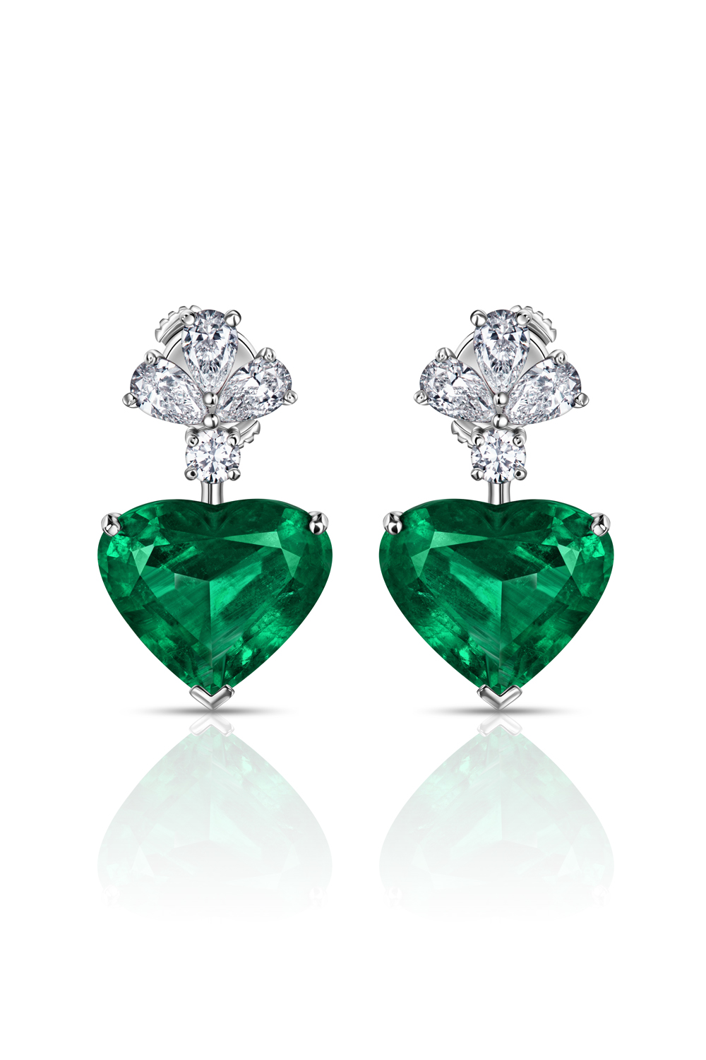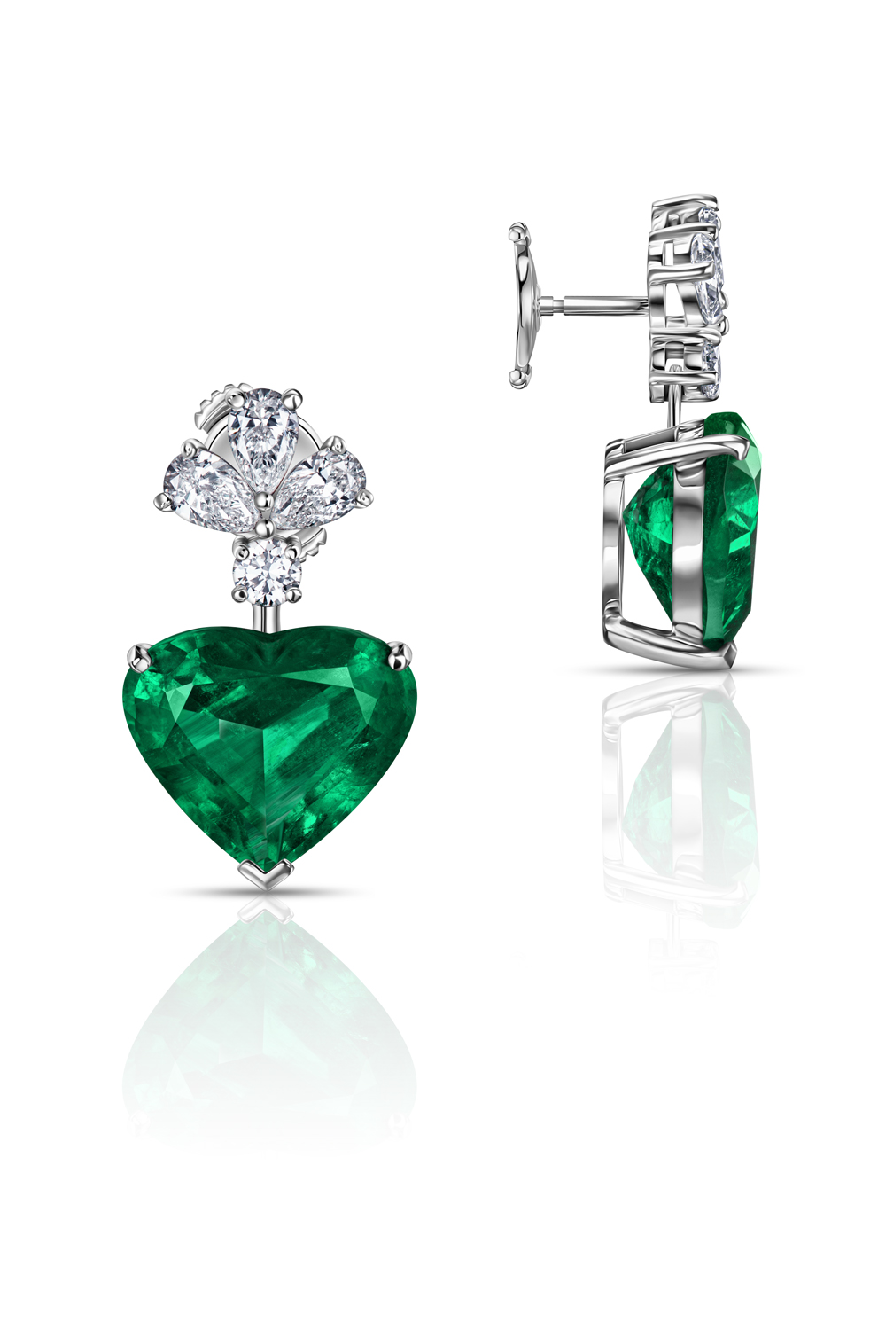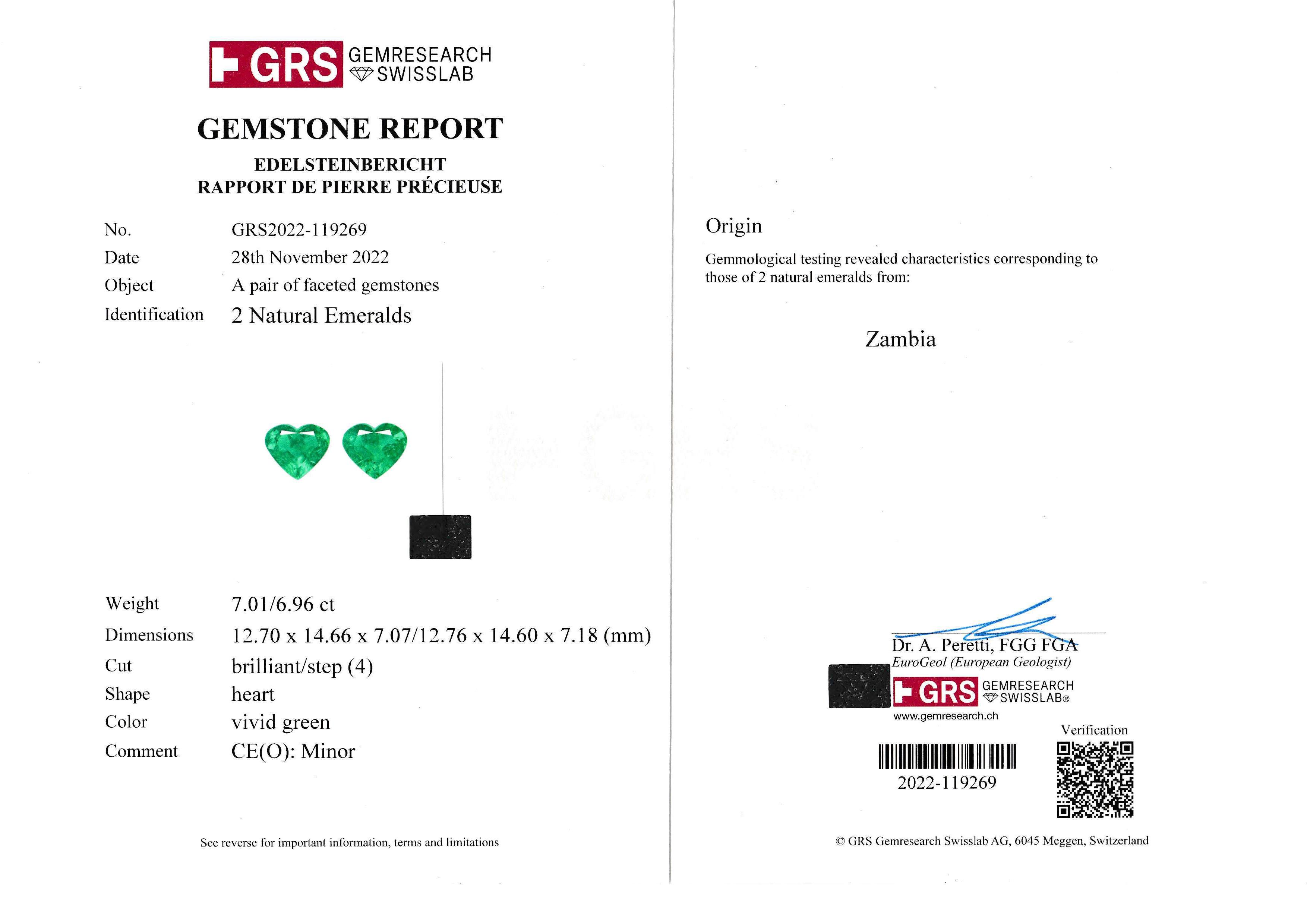 Handcrafted from the finest white gold 750°, these earrings exude sophistication and allure, making them a true treasure for any discerning collector. The pièce de résistance is undoubtedly the stunning emeralds, meticulously selected and precision-cut to bring out their full, vibrant potential. Weighing an impressive 7.01/6.96 ct, these "Vivid Green" heart-shaped gems are a testament to the exceptional quality and rarity of the materials used.
