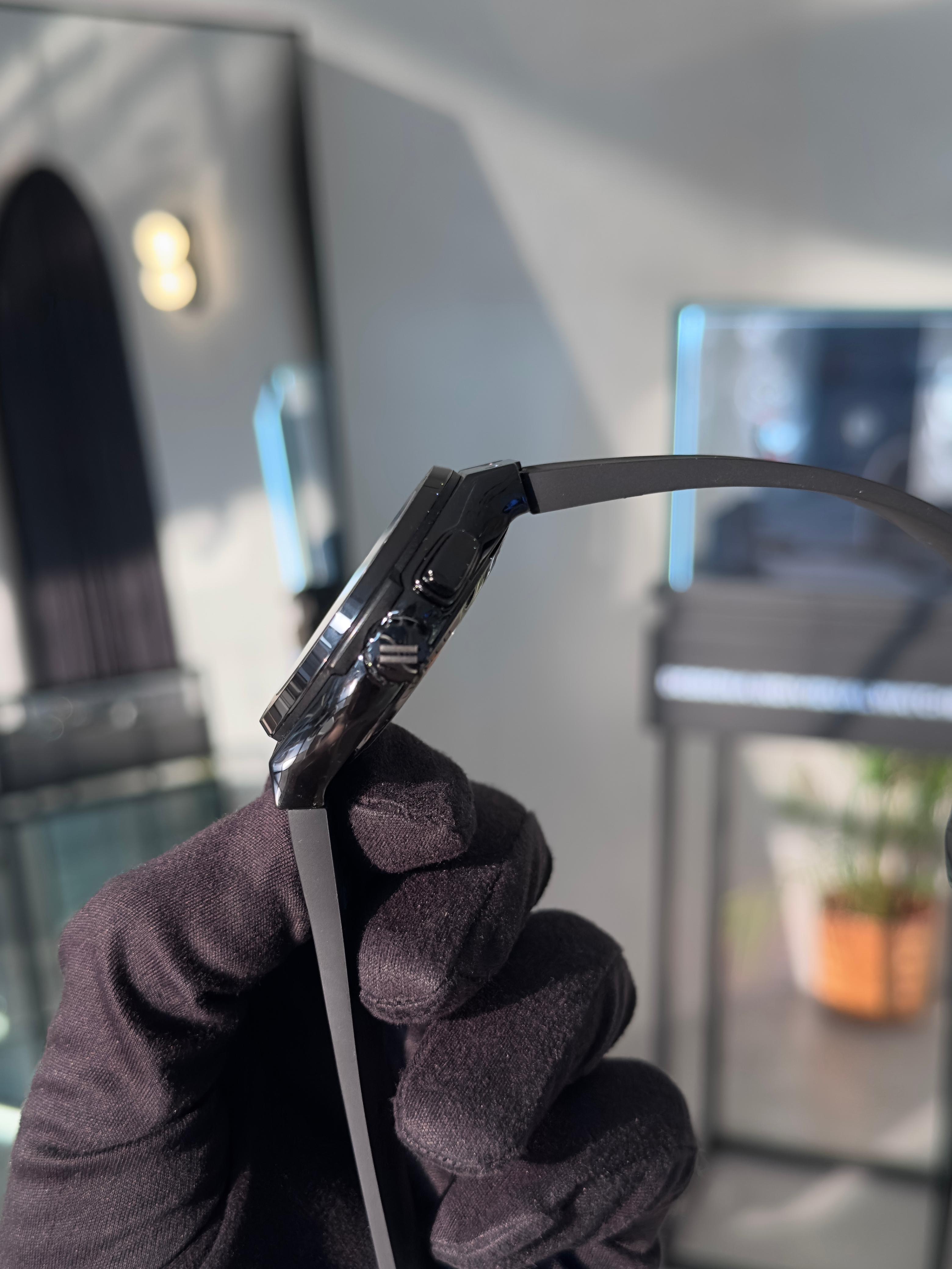Hublot Classic Fusion Tourbillon Skeleton All Black с референсным номером 506.CM.0140.LR — это ограниченная серия мужских часов, выпущенная в количестве 99 экземпляров. Корпус диаметром 45 мм выполнен из черной керамики с полированной и сатинированной отделкой. Безель также изготовлен из черной керамики и закреплен шестью винтами в форме буквы "H". Скелетонизированный циферблат позволяет наблюдать за работой механизма, оснащенного турбийоном. Часы оснащены ручным заводом с калибром HUB6310, обеспечивающим запас хода до 115 часов. Ремешок сочетает черную резину и кожу аллигатора, а застежка выполнена из нержавеющей стали с черным PVD-покрытием. Водонепроницаемость модели составляет 50 метров.