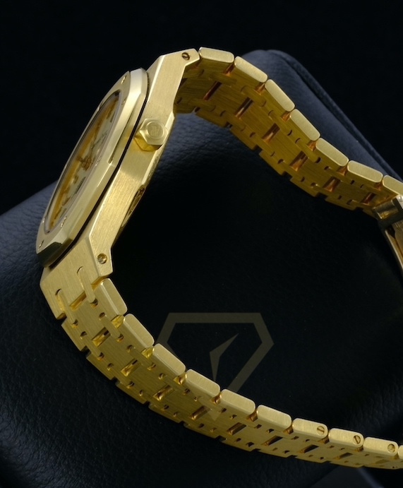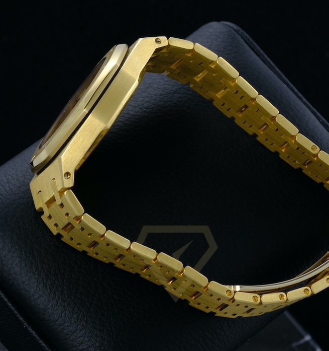 Housed in a sleek 36mm yellow gold case, this Audemars Piguet Royal Oak Day Date Moon Yellow Gold boasts a beautiful bracelet that not only adds to its aesthetic appeal but also ensures a comfortable wear. Paired with a sapphire crystal, the watch provides a clear view of its intricate mechanics, a true marvel for connoisseurs of fine timepieces. What sets this watch apart is its array of complications, including a mechanical self-winding mechanism, day of the week, moon phases, and date functions, making it as functional as it is beautiful.