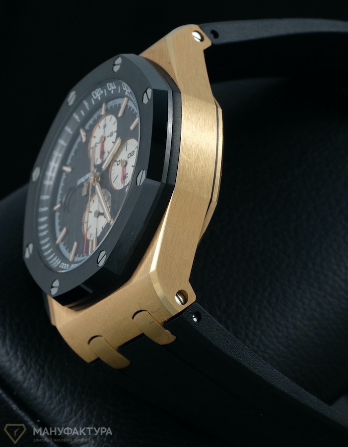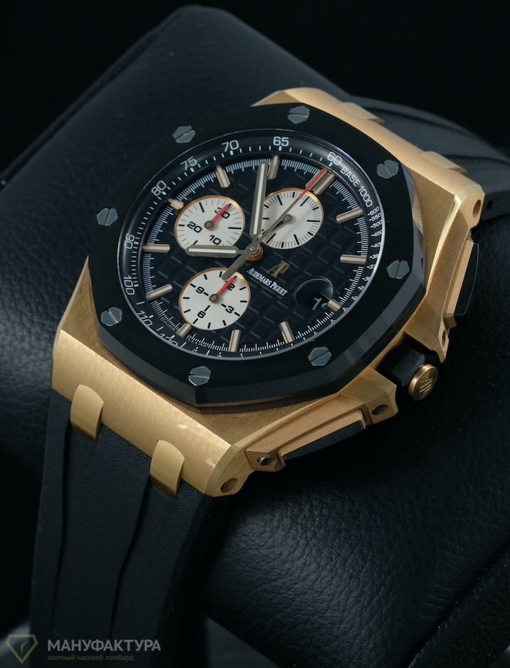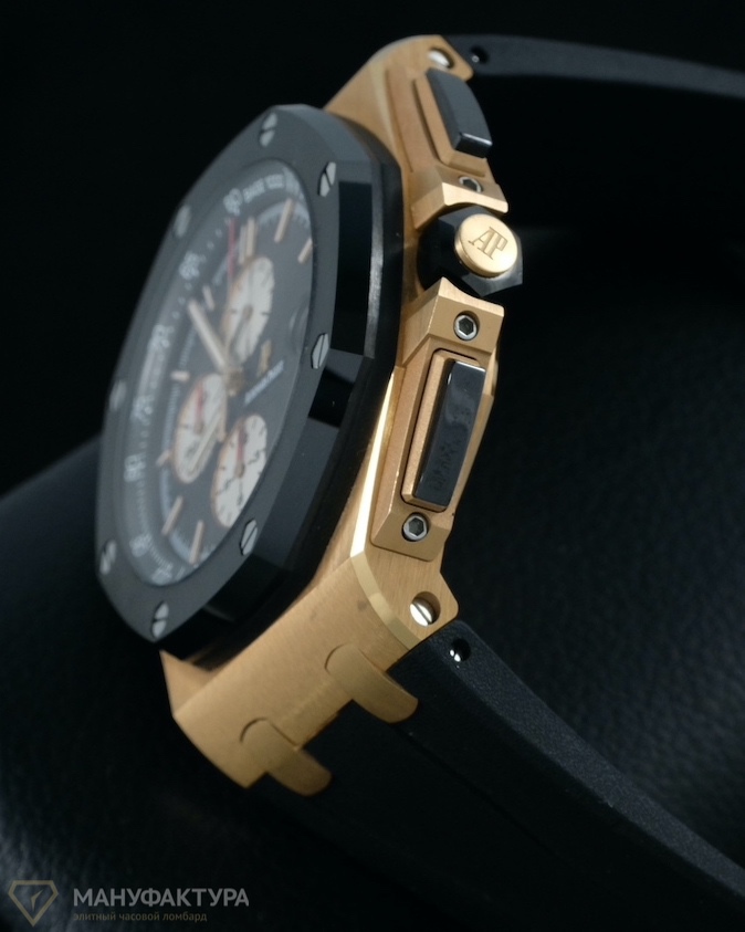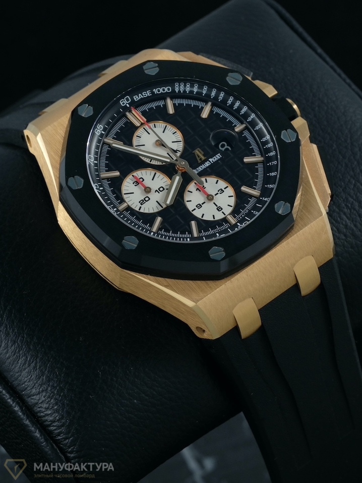 This Audemars Piguet Royal Oak Offshore Rose Gold watch is crafted from high-quality ceramics, showcasing a 44 mm case diameter, complemented by a stylish rubber strap. Complete with box and papers, this luxury timepiece boasts a Mechanical self-winding movement, along with a Chronograph and Date complications, all protected by a scratch-resistant Sapphire crystal. The watch is in good condition, ensuring it remains waterproof up to 100 meters, with a 1-year warranty and an impressive 50-hour power reserve, thanks to the precision engineering of the AP 3126/3840 caliber.