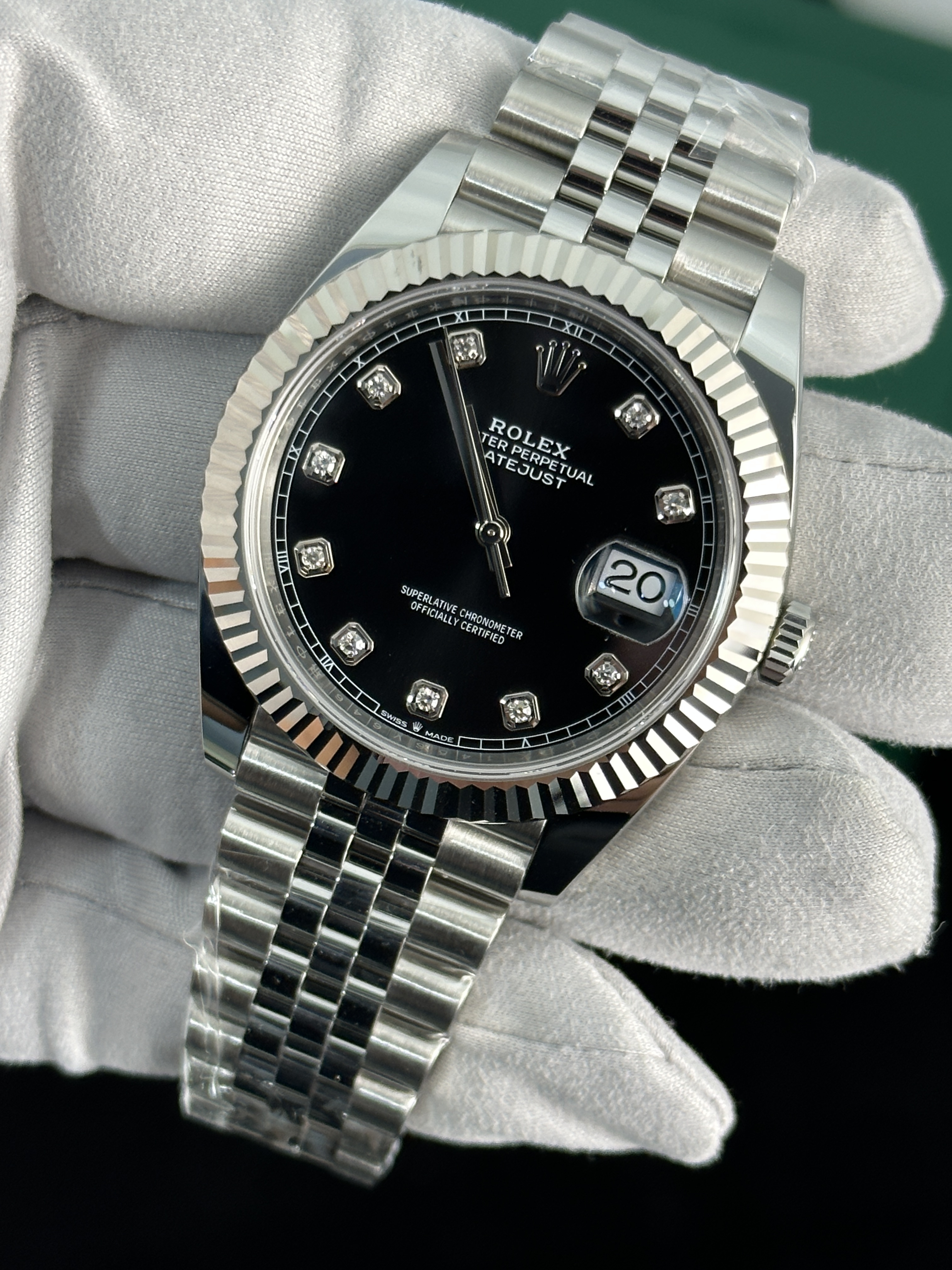 The Rolex Datejust 41mm Black Dial Diamonds, with its sleek 41 mm case diameter, showcases the brand's commitment to innovation and style. Powered by the precise Caliber 3235 movement, this timepiece promises a power reserve of up to 70 hours, ensuring it keeps you in sync with the rhythm of your busy lifestyle. With its sapphire crystal glass and 100 meters of water resistance, this watch is not just a fashion statement but also a reliable companion for any adventure.