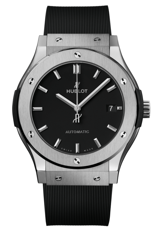 At 45mm in diameter, this sleek timepiece is crafted from the finest black titanium, showcasing Hublot's innovative approach to materials. Paired with a premium leather strap, this watch not only promises exceptional comfort but also adds a touch of sophistication to any ensemble. The transparent sapphire crystal reveals the intricate mechanical self-winding movement, further highlighting the brand's commitment to excellence. Additionally, the date complication offers a practical touch, making this timepiece both stylish and functional.