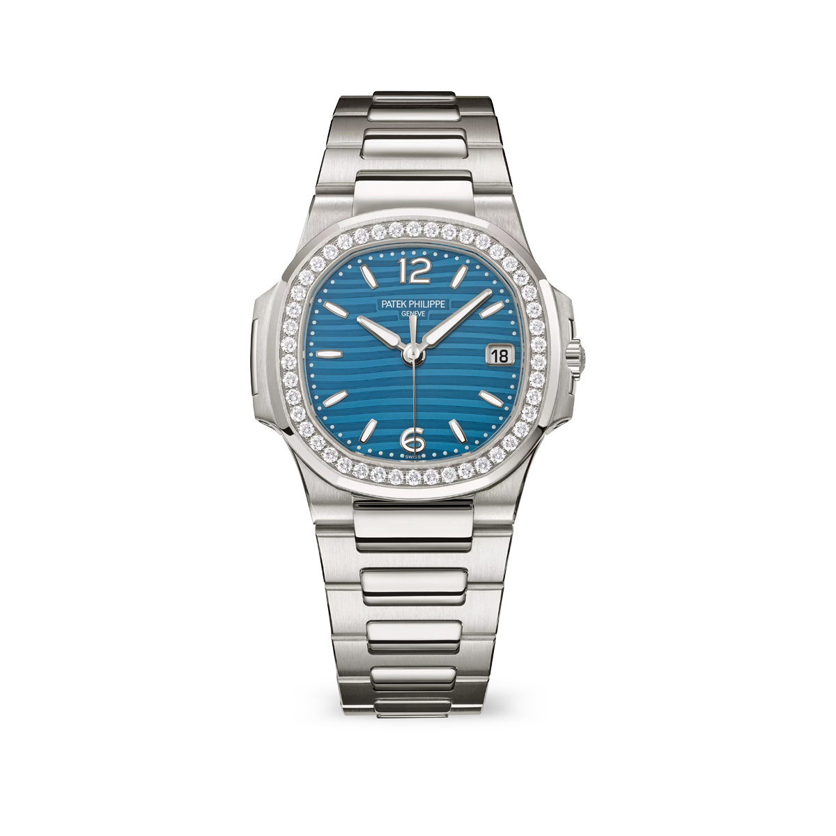 Sporty and refined This Ladies’ Nautilus with quartz movement, 32 mm-diameter case and white gold bracelet is distinguished by the azure blue color of its lacquered dial adorned with the collection’s typical wave pattern. The case design is enhanced by alternating satin-brushed and polished finishes. The bezel is lit up by a row of brilliant-cut diamonds.