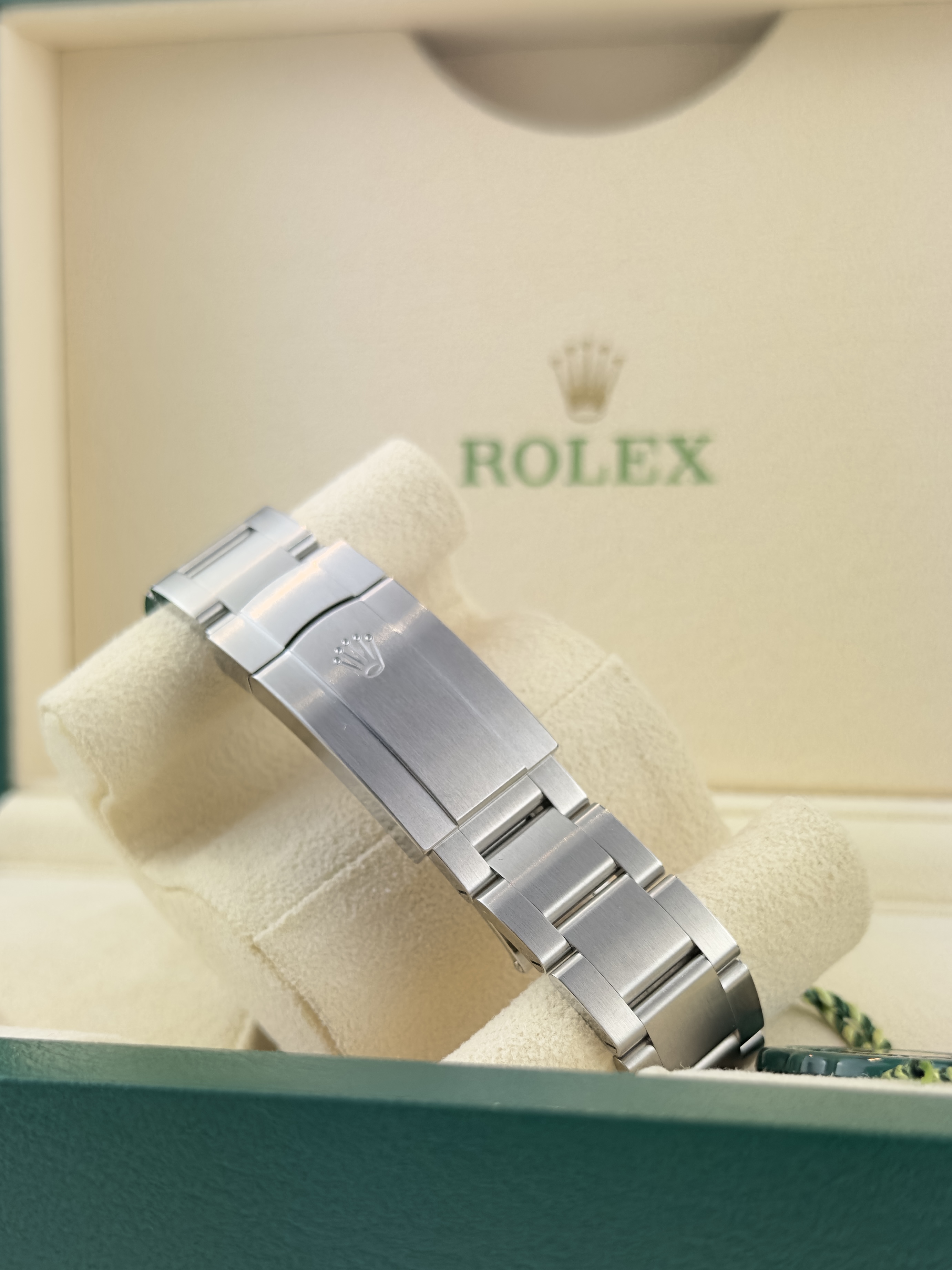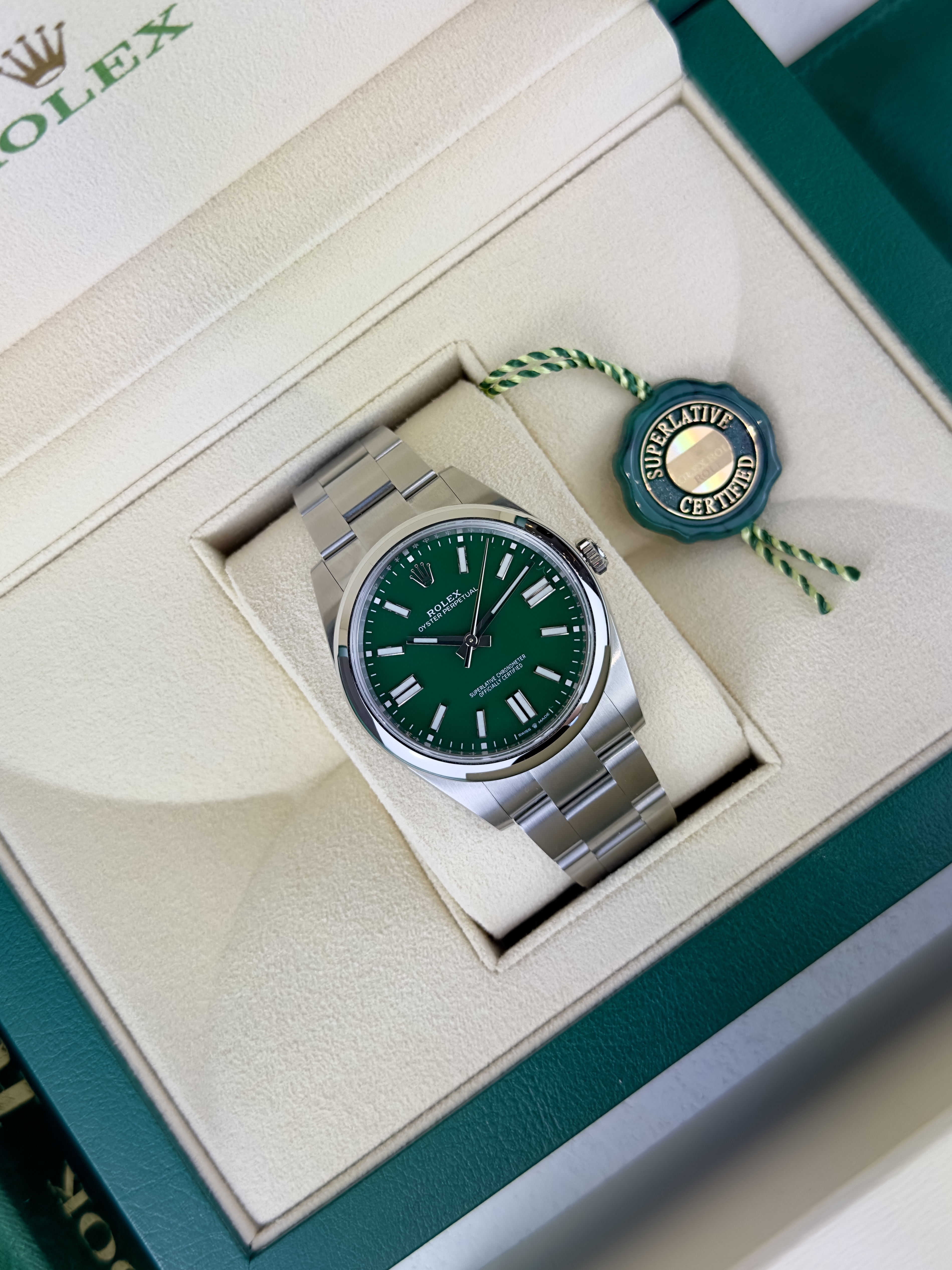 Buy Rolex Oyster Perpetual 41 mm Green Dial in Dubai and indulge in the splendor of this 41 mm masterpiece, featuring a stunning green dial that radiates sophistication and style. Housed within a robust 41 mm steel case, this watch boasts a sleek bracelet that not only enhances its aesthetic appeal but also ensures comfort and durability. The beauty of this timepiece extends beyond its visual allure, as it is powered by the in-house caliber 3230, a marvel of mechanical self-winding technology.
