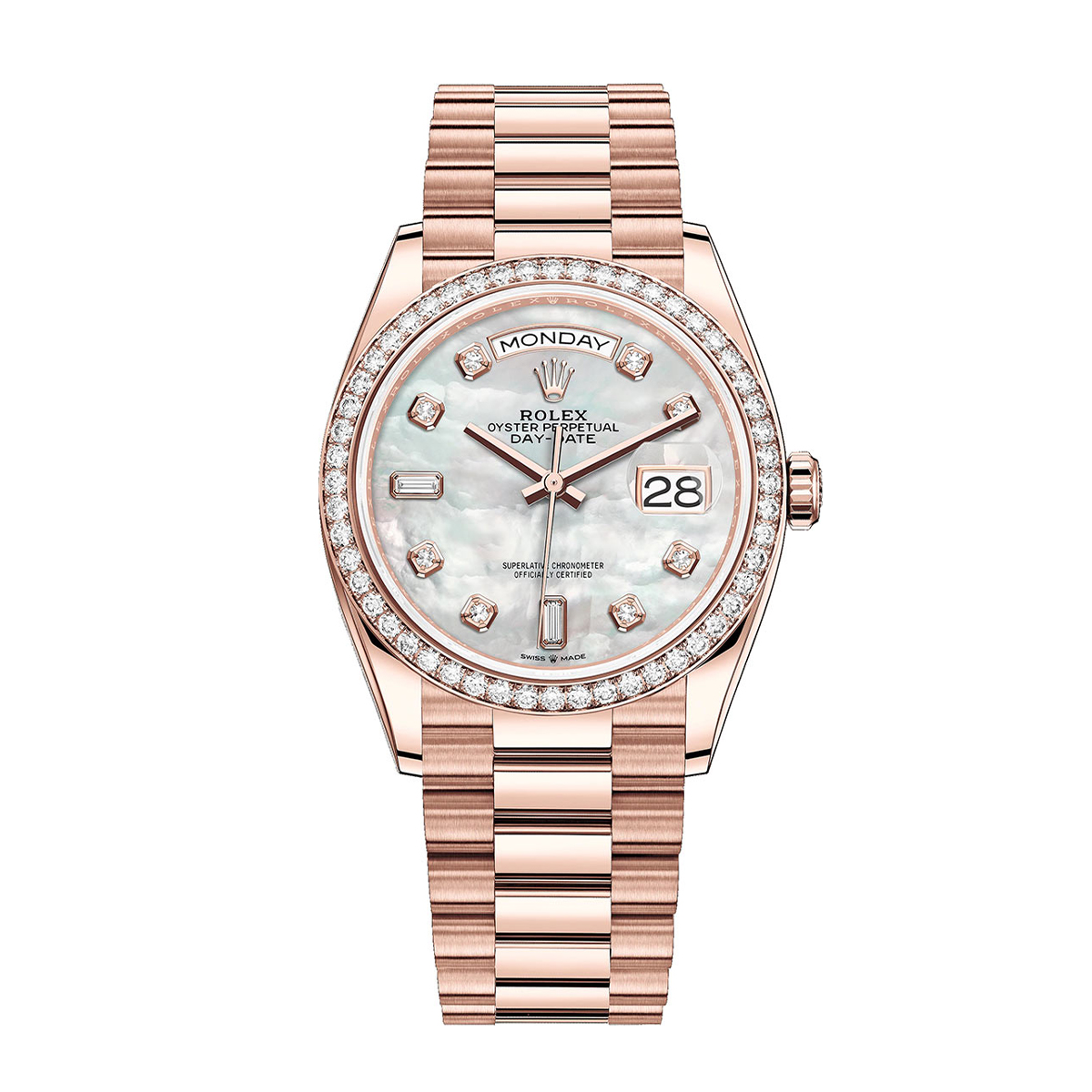 Experience the ultimate blend of tradition and innovation with this Rolex Watch Day-Date 36mm Everose MOP, a 36mm marvel crafted from diamonds, a choice that not only reflects the brand's commitment to excellence but also adds an unparalleled touch of elegance. Paired with a sleek bracelet and protected by a sapphire crystal, this timepiece is not only a work of art but also a robust companion for any adventure, thanks to its mechanical self-winding mechanism, day of the week, and date complications, ensuring that you stay on top of your schedule in style.