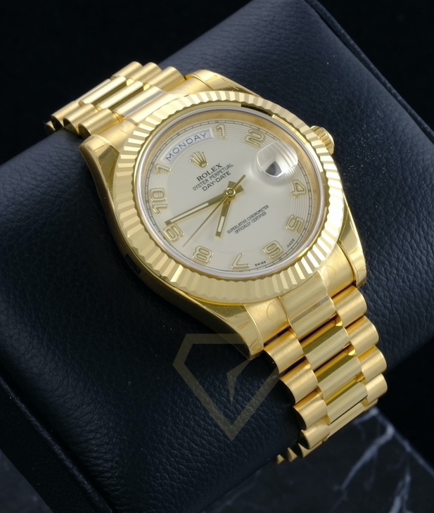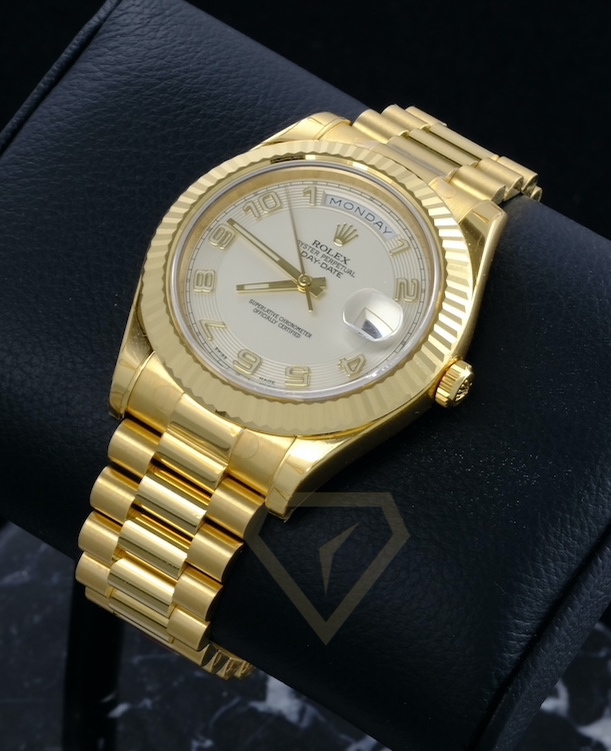 Crafted for connoisseurs of luxury, this extraordinary Rolex Day-Date II 41mm Yellow Gold President Ivory is a testament to refined taste and grandeur. This impeccable timepiece is not just a watch, but a statement piece that demands attention. Buy Rolex Day-Date II 41mm Yellow Gold President Ivory in Dubai, and discover the pinnacle of watchmaking at Watchlab Boutique, where horological excellence meets unparalleled service.