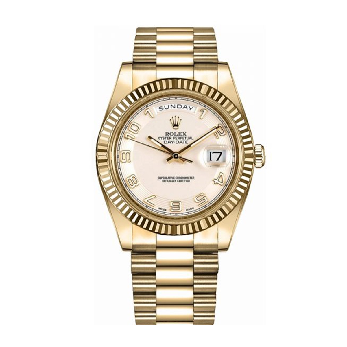 The Rolex Day-Date II 41mm Yellow Gold President Ivory is a marvel of mechanical engineering, featuring a 41mm yellow gold case, beautifully complemented by a matching yellow gold President bracelet. This timepiece is not only a stylish accessory but also a precise instrument, thanks to its mechanical self-winding movement, caliber 3156, which boasts a 48-hour power reserve. The Day-Date II complication allows for the display of the day of the week, adding an extra layer of sophistication to this already extraordinary piece. Buy Rolex Day-Date II 41mm Yellow Gold President Ivory in UAE, and experience the epitome of luxury on your wrist.