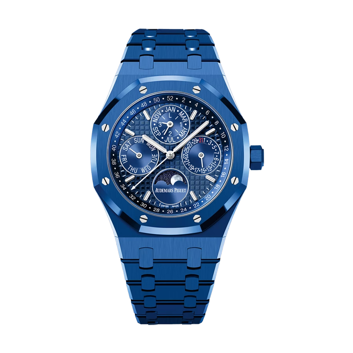 Complications Mechanical self-winding, Perpetual calendar, Day of the week, Month, Moon phases, Date