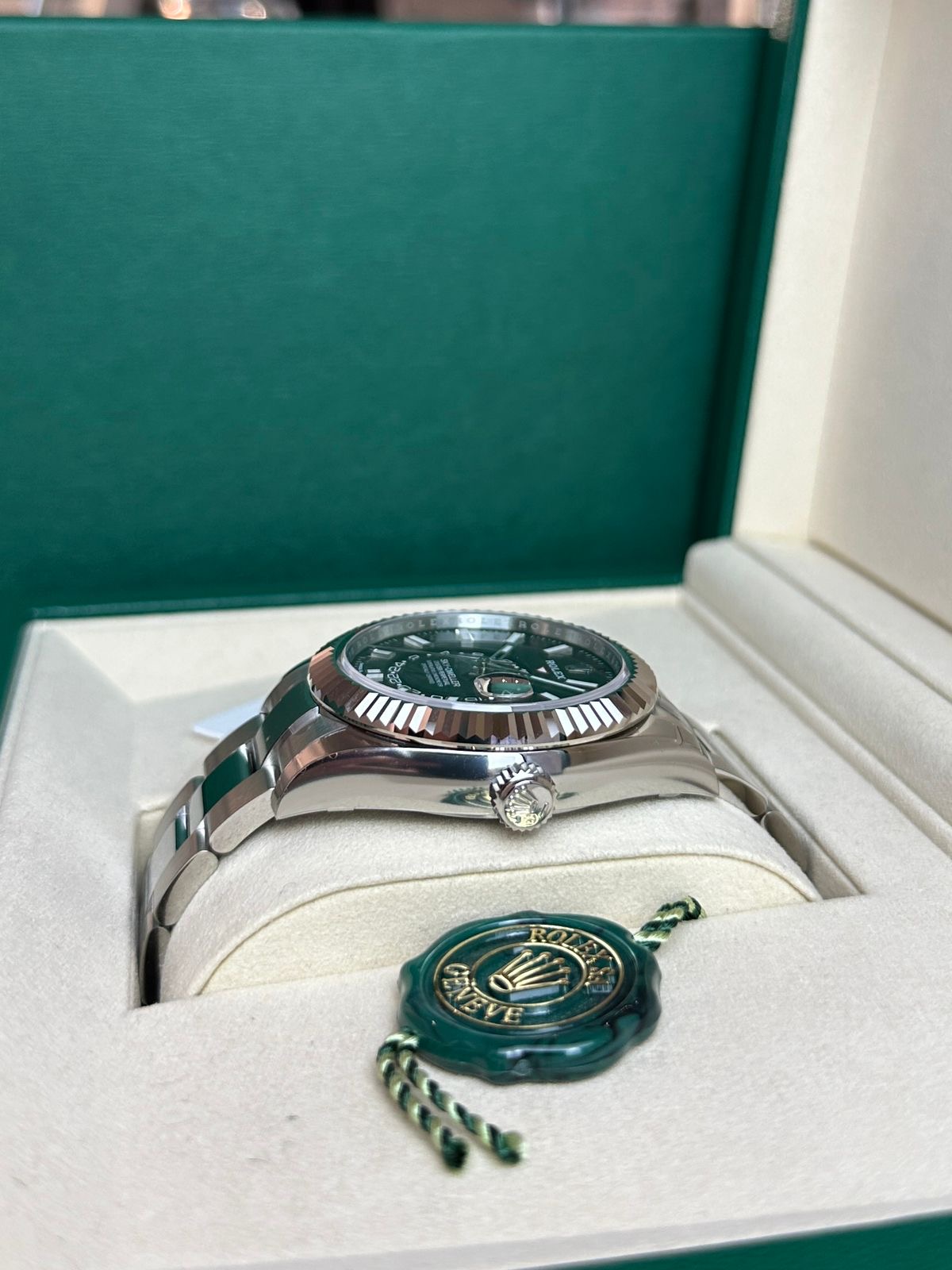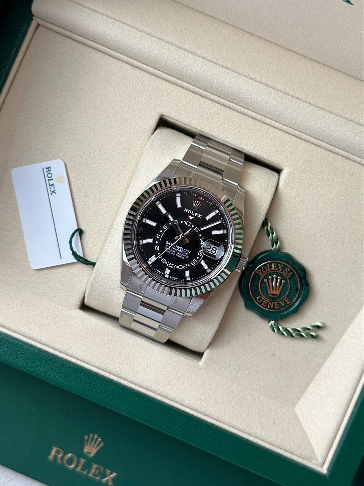 With a 72-hour power reserve and 100 meters of water resistance, this timepiece is designed to keep pace with your active lifestyle. As a new piece from 2024, it comes complete with its original box and papers, accompanied by a 5-year warranty. Buy Rolex Sky-Dweller Black Dial Oyster bracelet in UAE, and own a masterpiece that combines style, precision, and heritage.