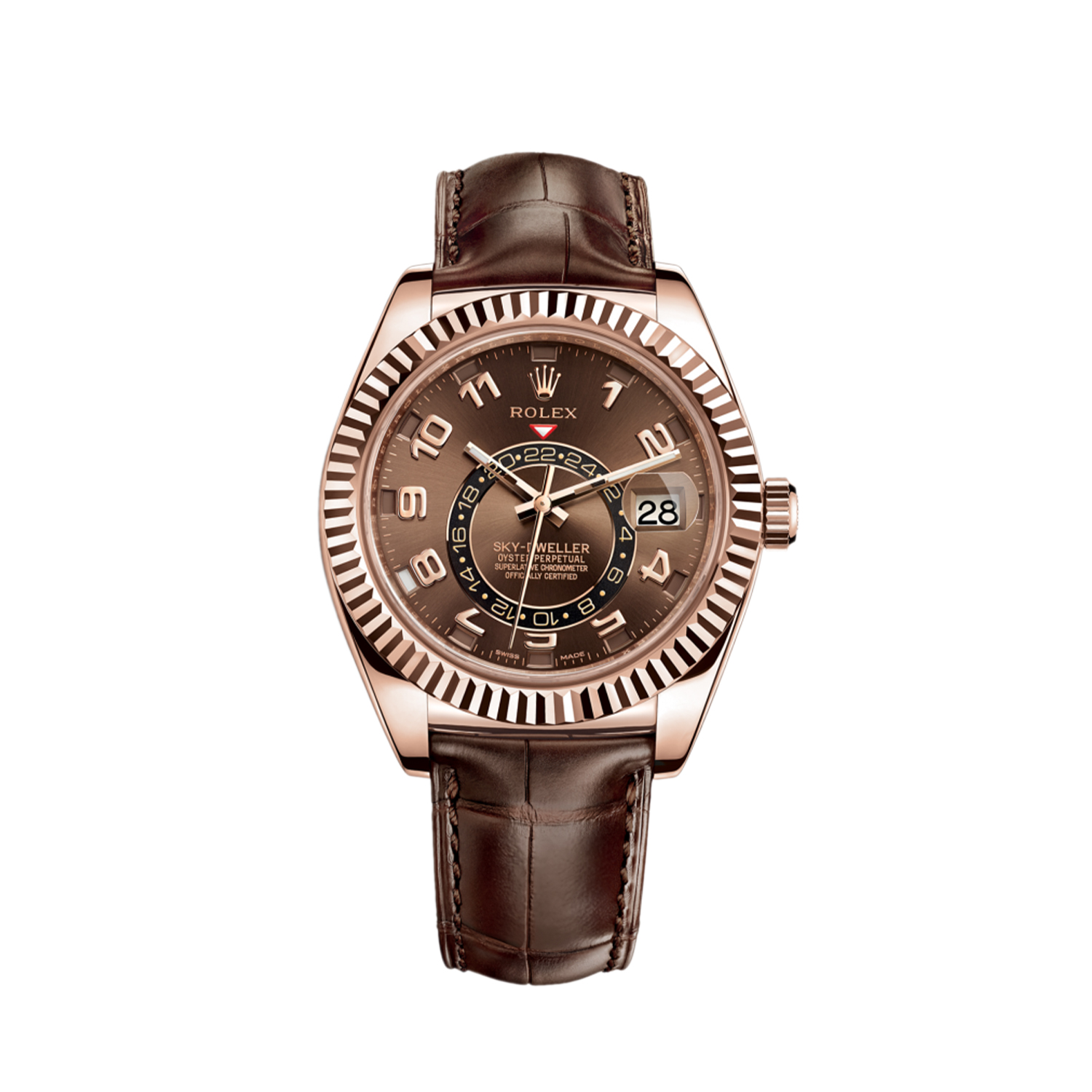 The Rolex Sky-Dweller Everose Gold Chocolate Dial is equipped with a mechanical self-winding movement, featuring complications such as a second time zone, month, and date displays. Its sapphire glass crystal is a testament to its durability and attention to detail, ensuring that every aspect of this watch is crafted with the highest standards in mind. With a 3-year warranty and an impressive 72-hour power reserve, you can be certain of its reliability and performance.