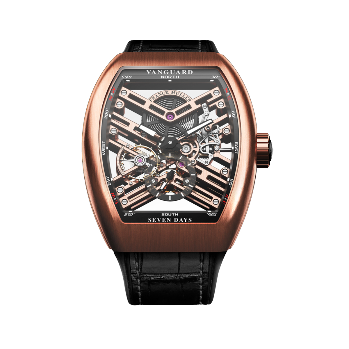 Franck Muller's Watch Vanguard Skeleton is a masterpiece that showcases the brand's expertise in creating intricate, avant-garde timepieces. This particular model, featuring a sleek barrel-shaped case crafted from 18k rose gold, measuring 44x53.7 mm in diameter, is a testament to the brand's attention to detail and commitment to excellence. The case is beautifully paired with a high-quality leather strap, ensuring a comfortable fit and sophisticated look.