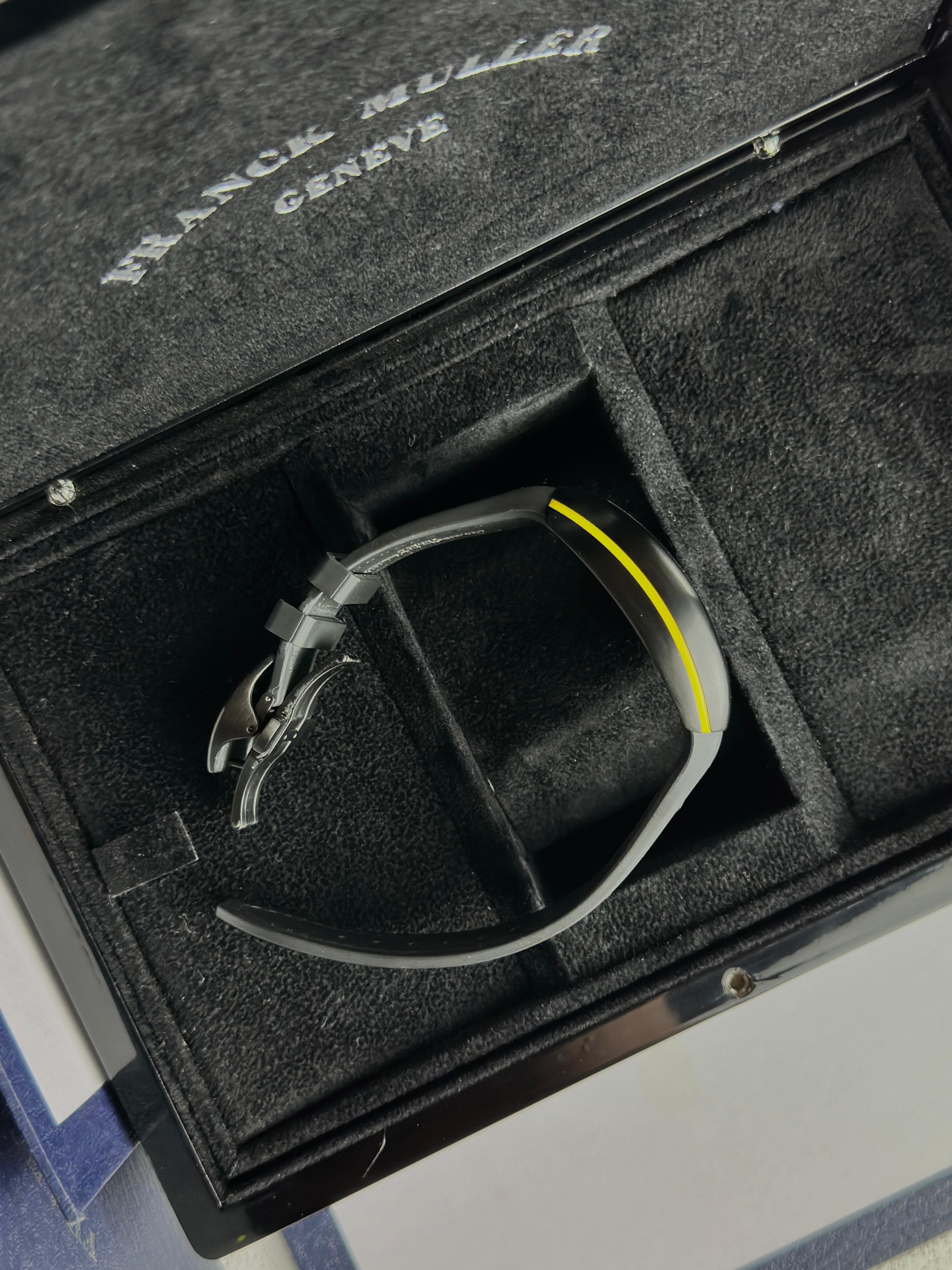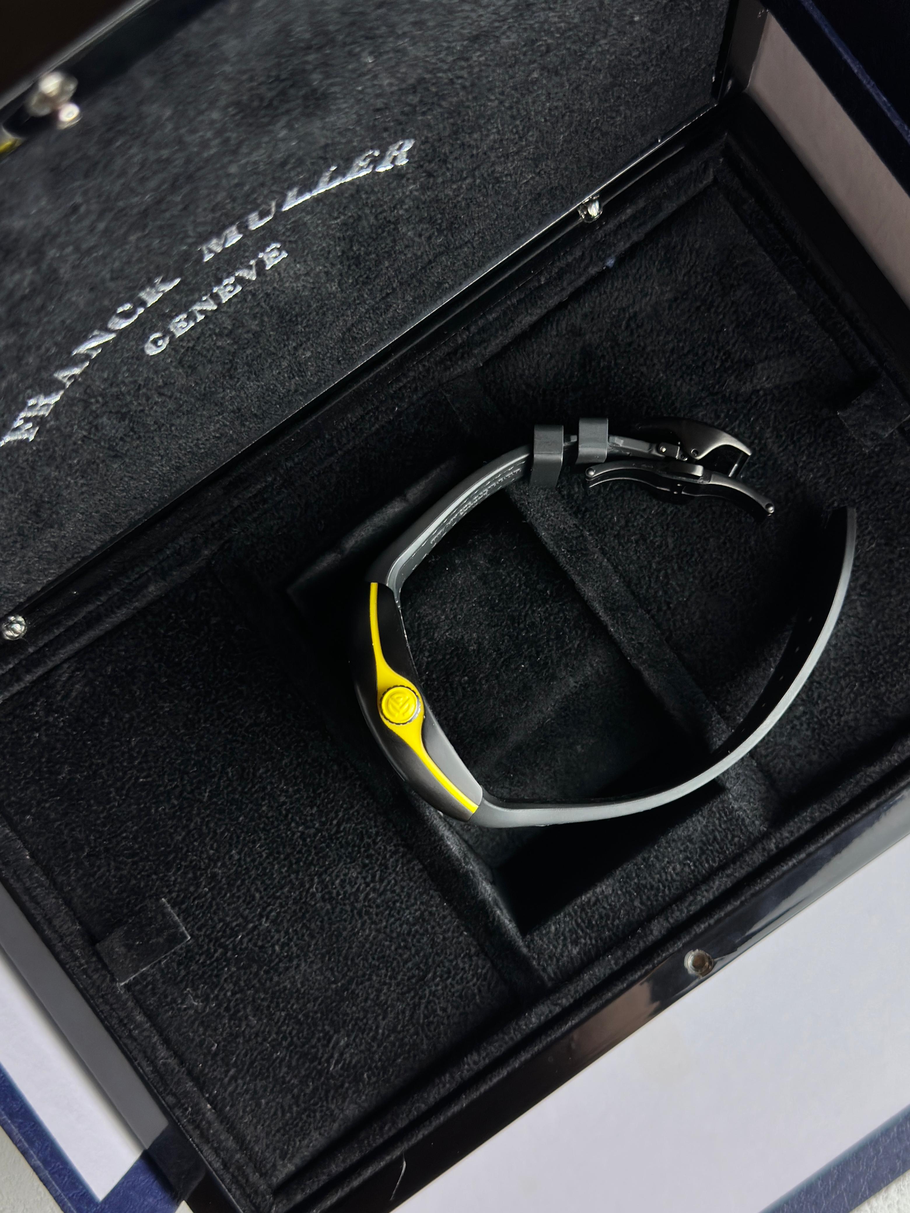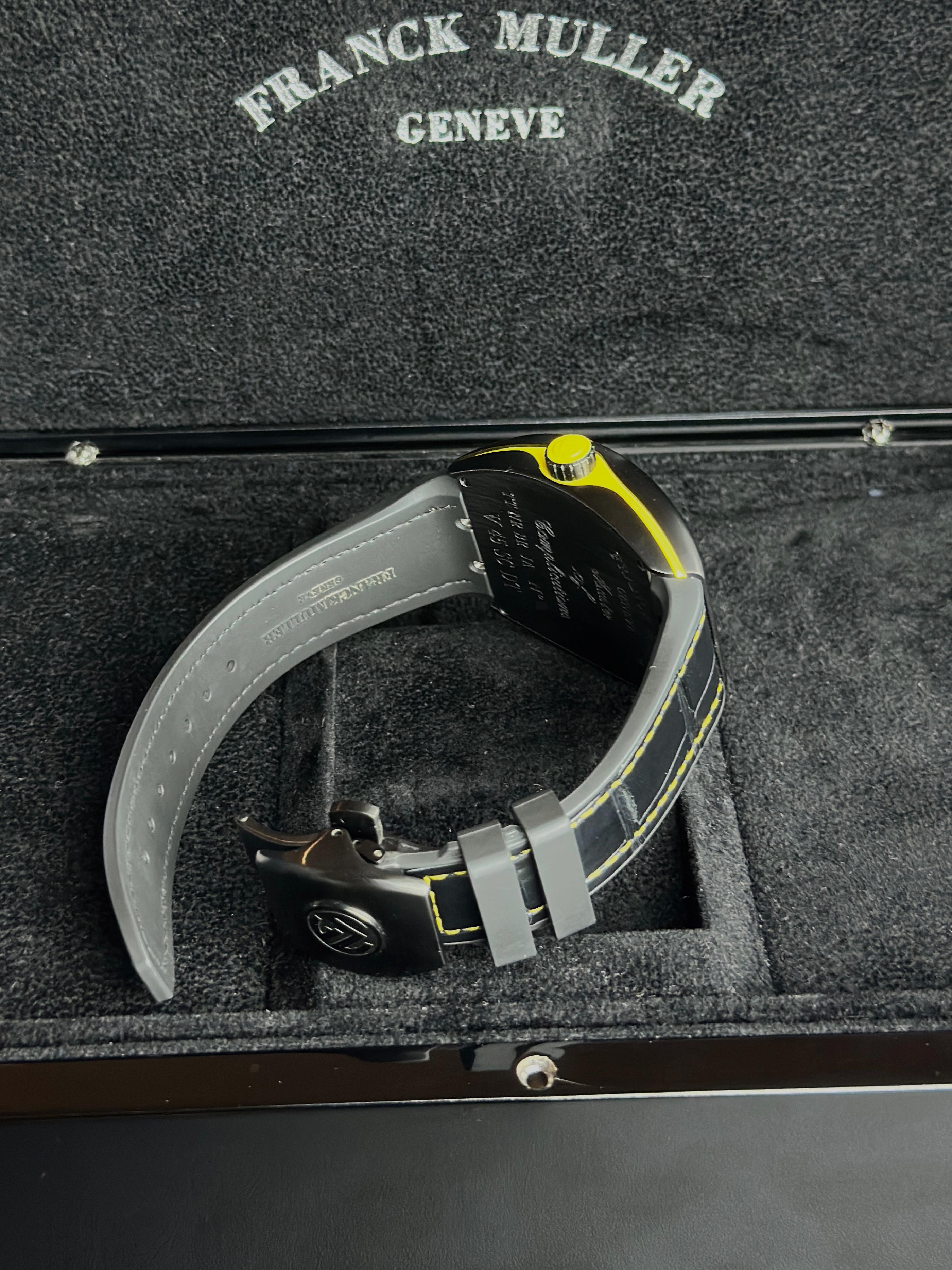 This exquisite timepiece is encased in sleek, lightweight Titanium, measuring 45 mm in diameter, perfectly balanced for any wrist size. The striking black and yellow dial is a true testament to Franck Muller's innovative spirit and attention to detail. Powered by a reliable mechanical self-winding movement, this watch not only keeps perfect time but also features a practical date function. The movement's craftsmanship is on full display through the transparent sapphire crystal, adding an extra layer of sophistication to this masterpiece.