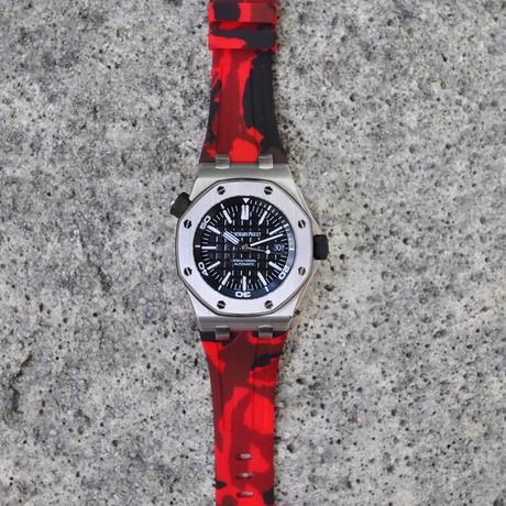 This new, premium RED CAMO AP DIVER 42MM Strap from Audemars Piguet is a masterpiece of design and craftsmanship. Its unique camouflage pattern adds a sporty touch to your Audemars Piguet watch, making it a standout piece in your collection. Whether you're looking to elevate your everyday style or make a bold fashion statement, this strap is sure to impress.